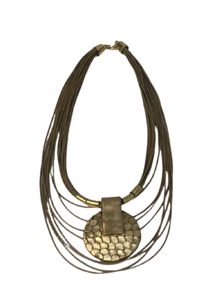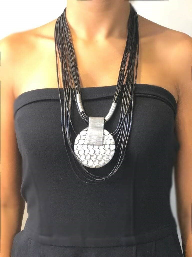 A cascade of cotton strings complemented by a ceramic pendant create our statement necklace for this summer! Marilia Capisani's cold ceramic now has a new scales texture, making it even more instigating! This Necklace has a cold ceramic pendant attached to waxed cotton strings with silver plated accents and clasp